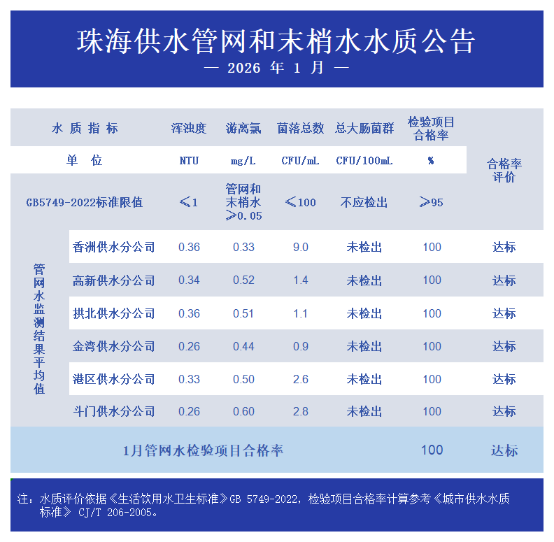 2026年1月珠海供水管网和末梢水水质公告