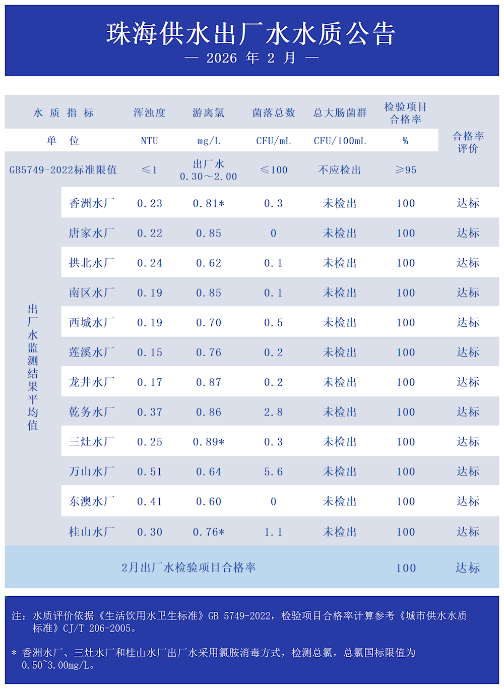 2026年2月珠海供水出厂水水质公告