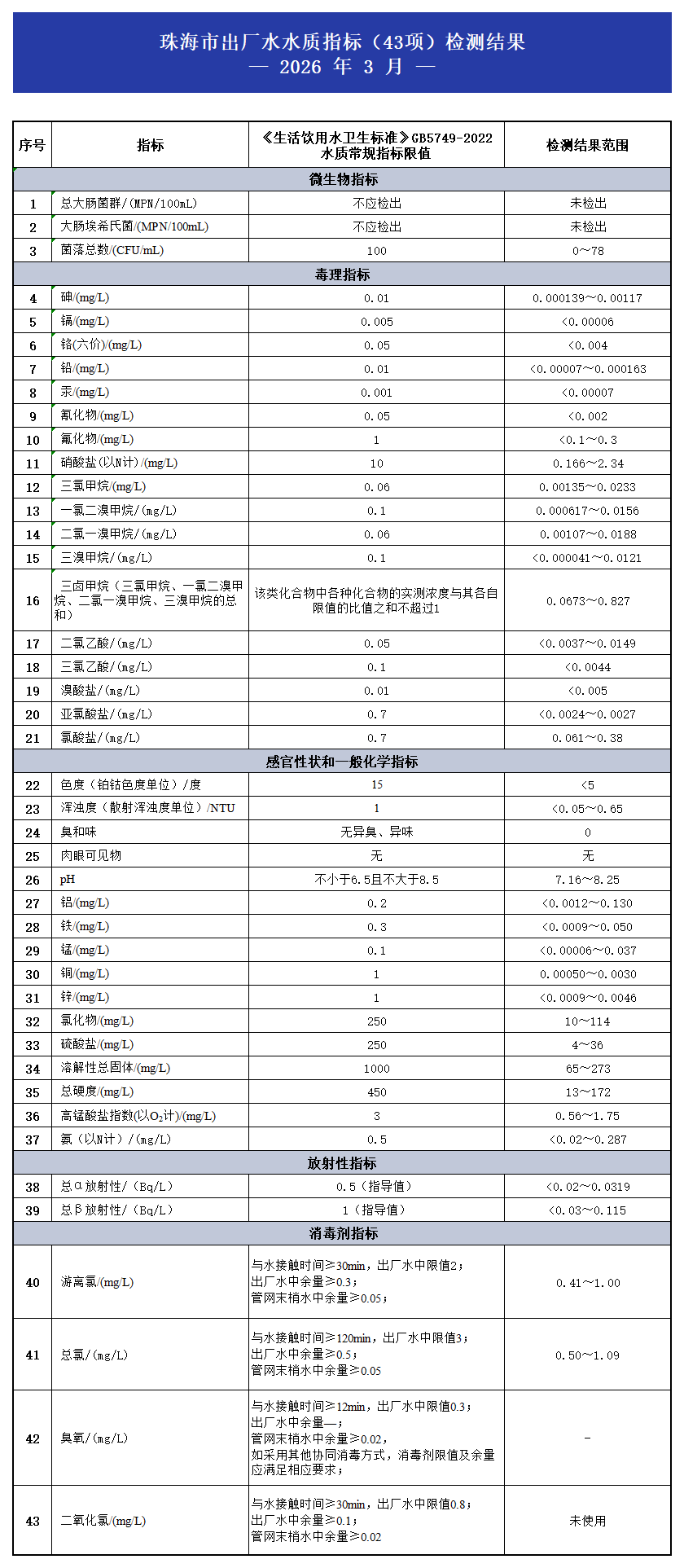 2026年3月珠海市出厂水水质指标(43项)检测结果